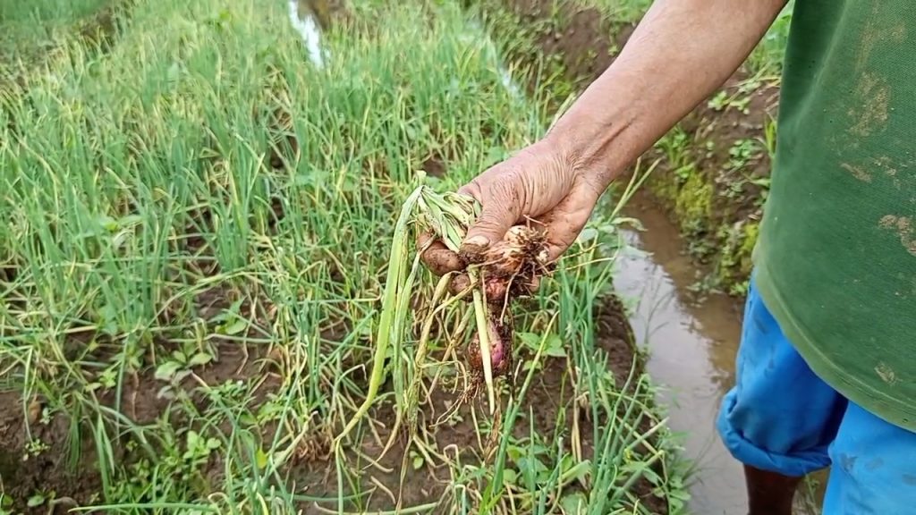 Sejumlah petani mengaku merugi hingga jutaan rupiah akibat tanaman bawangnya rusak diserang hama pascahujan deras. Pasalnya, jika panen berjalan normal, satu lahan bisa menghasilkan hingga lima kuintal bawang. Namun, dengan kondisi seperti ini, hasil panen hanya mencapai dua kuintal saja.