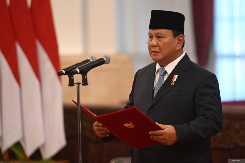 Arsip - Presiden Prabowo Subianto membacakan sumpah saat upacara pelantikan wakil menteri Kabinet Merah Putih di Istana Negara, Jakarta, Senin (21/10/2024). . ANTARA FOTO/Hafidz Mubarak A/Lmo/tom