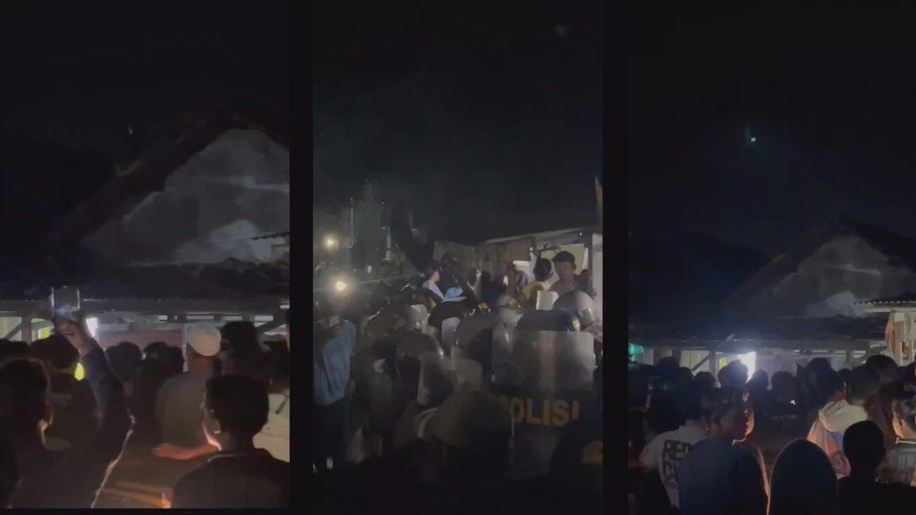 Petugas tampak menahan dorongan warga dan berusaha menghindar dari lemparan bambu serta sejumlah barang yang diarahkan ke barisan polisi.